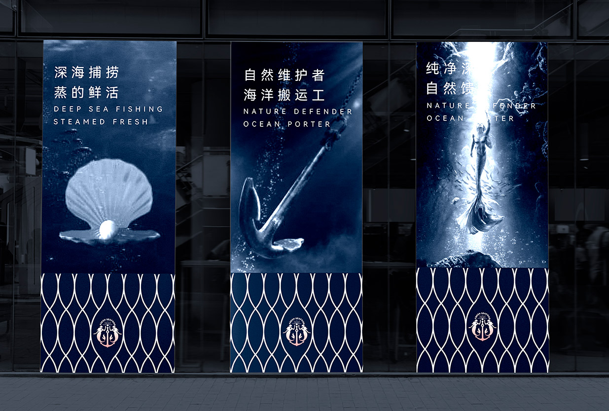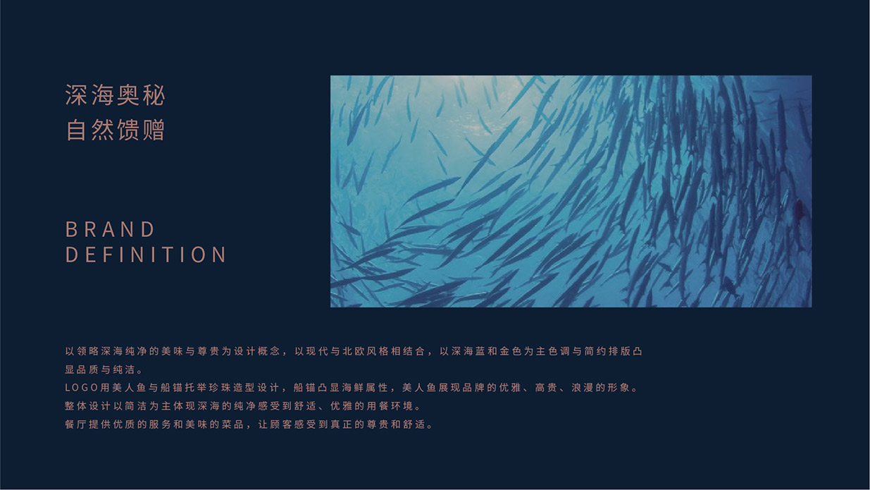 Introduction:深海奧秘:領(lǐng)略純凈美味與尊貴自然賦予的寶藏,深海的奧秘,是我們品牌設(shè)計(jì)的靈感源泉。我們希望通過(guò)現(xiàn)代與北歐風(fēng)格的獨(dú)特結(jié)合,為您描繪出深海純凈、尊貴的美味世界。深海藍(lán)與金色的主色調(diào),象征著深海的廣袤與豐富,同時(shí)也傳遞出我們品牌的高貴與優(yōu)雅。簡(jiǎn)約的排版風(fēng)格,使整個(gè)設(shè)計(jì)更顯純粹與品質(zhì),凸顯我們產(chǎn)品的純潔與安全。我們的LOGO設(shè)計(jì)靈感來(lái)源于美人魚(yú)與船錨。船錨是海洋的象征,代表著我們品牌的海鮮屬性。而美人魚(yú)則代表著品牌的優(yōu)雅、高貴與浪漫,同時(shí)也是我們對(duì)美好生活的追求。兩者共同托舉著珍珠造型,猶如一幅美麗的海洋畫(huà)卷,展現(xiàn)出品牌的尊貴與獨(dú)特。整體設(shè)計(jì)以簡(jiǎn)潔為主,體現(xiàn)出深海的純凈與廣闊。我們希望每一位顧客在享用美食的同時(shí),也能感受到我們對(duì)品質(zhì)的追求和對(duì)環(huán)境的尊重。優(yōu)質(zhì)的服務(wù)和美味的菜品,是我們對(duì)每位顧客的承諾。我們希望通過(guò)我們的努力,讓每一位顧客都能感受到真正的尊貴和舒適。
