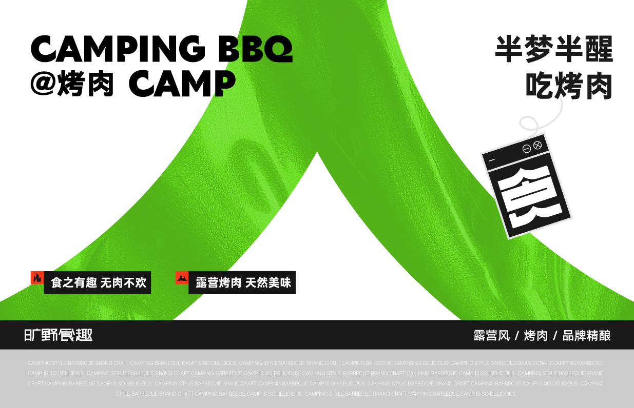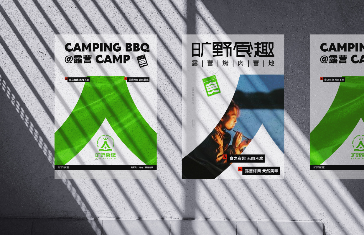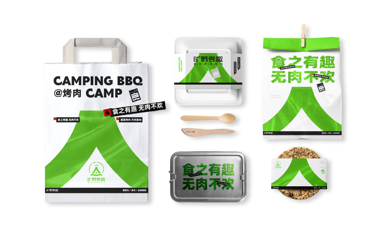 Introduction:“曠野食趣”寓意著在廣闊的野外享受美食的樂(lè)趣。體現(xiàn)了品牌的露營(yíng)風(fēng)格,也表達(dá)了為消費(fèi)者提供的輕松愉快的餐飲體驗(yàn)。品牌整體風(fēng)格以輕松明快的嫩綠色為主,搭配黑色,醒目且富有現(xiàn)代感。這種顏色搭配既符合露營(yíng)的自然氣息,又具有現(xiàn)代感,能夠吸引年輕消費(fèi)者的關(guān)注。品牌logo以“人”字結(jié)合帳篷形狀,體現(xiàn)了品牌的露營(yíng)特色。這個(gè)設(shè)計(jì)簡(jiǎn)潔明了,易于識(shí)別和記憶,同時(shí)也體現(xiàn)了品牌注重戶外體驗(yàn)的特點(diǎn)。
