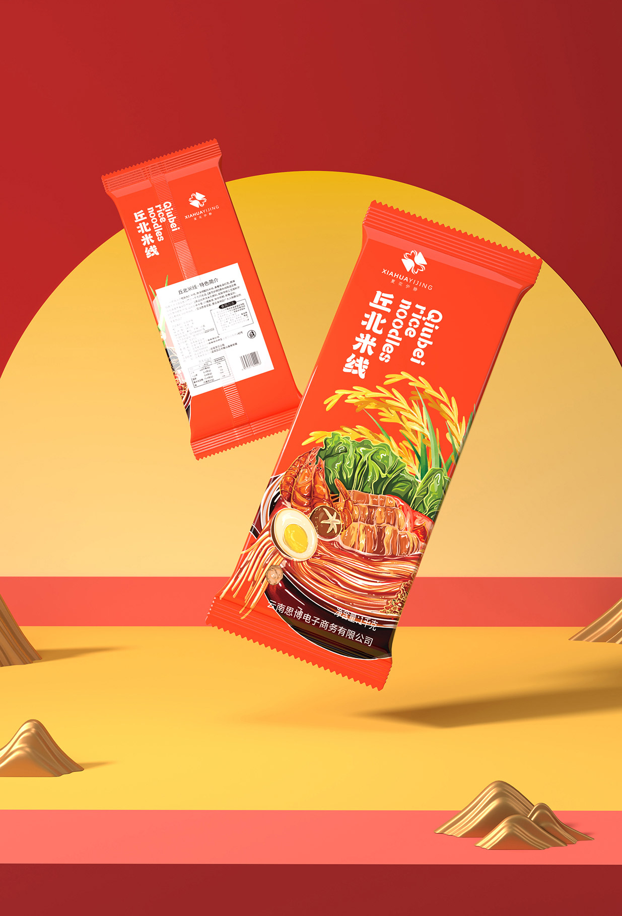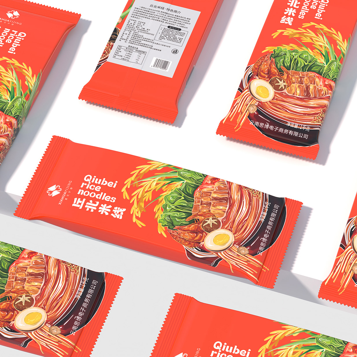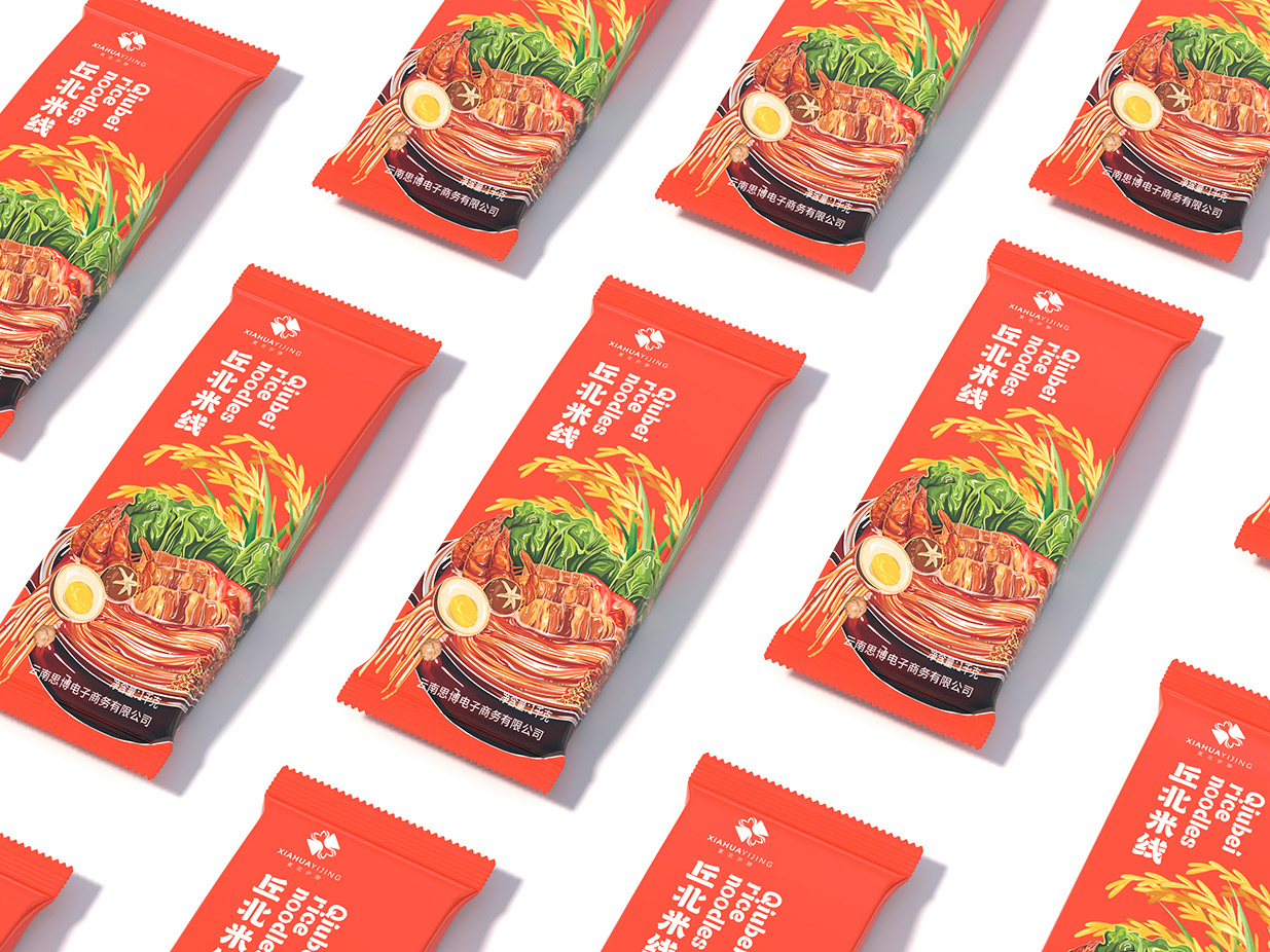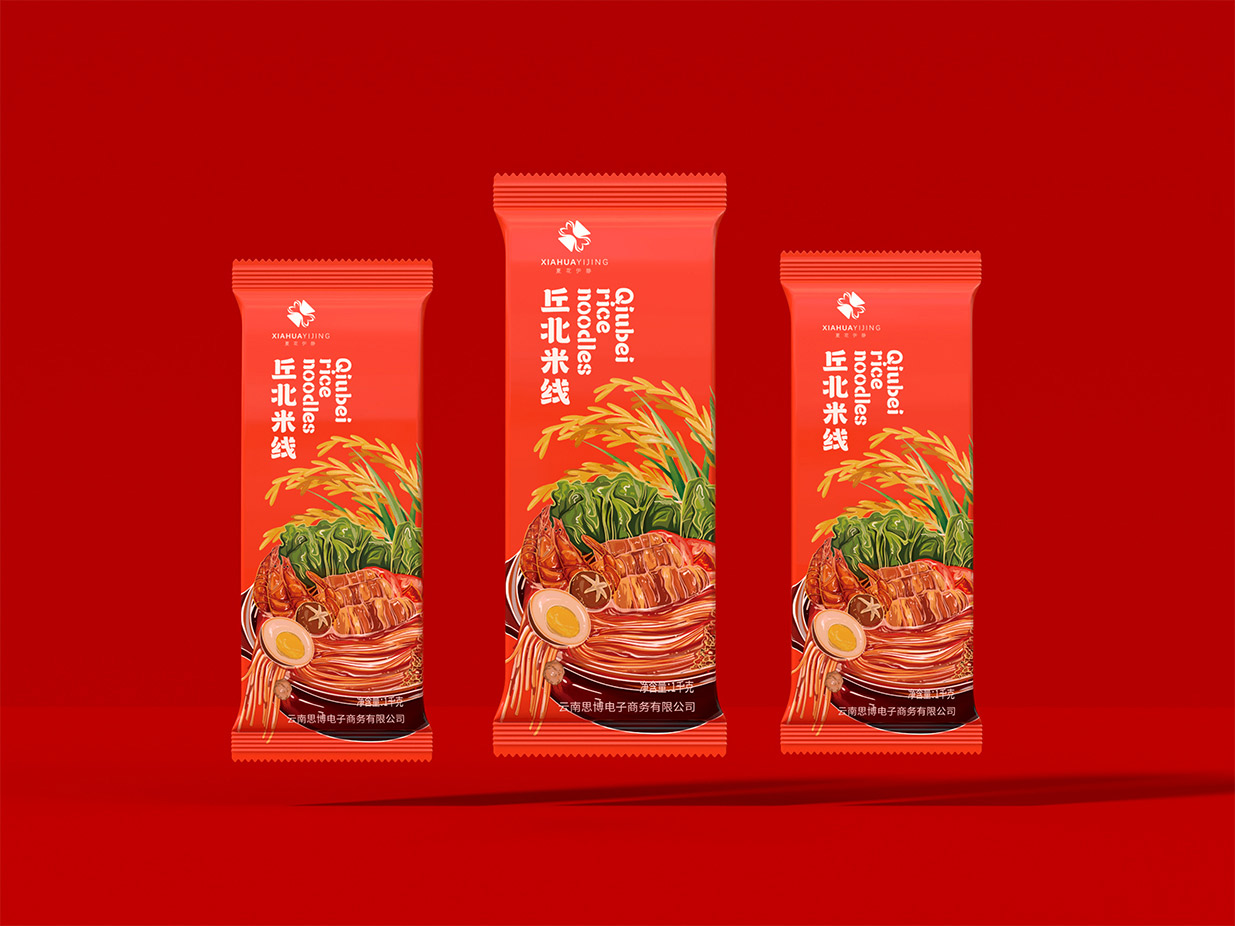 Introduction:本包裝設(shè)計旨在通過視覺藝術(shù)傳達(dá)云南丘北米線的獨特地域文化與美味特色,融合傳統(tǒng)與現(xiàn)代元素,以吸引消費者的注意力并激發(fā)其購買欲望。采用米線插畫作為主要設(shè)計元素,結(jié)合橘紅色底色,既展現(xiàn)了產(chǎn)品的地域特色,又賦予了包裝時尚活力的氣息。