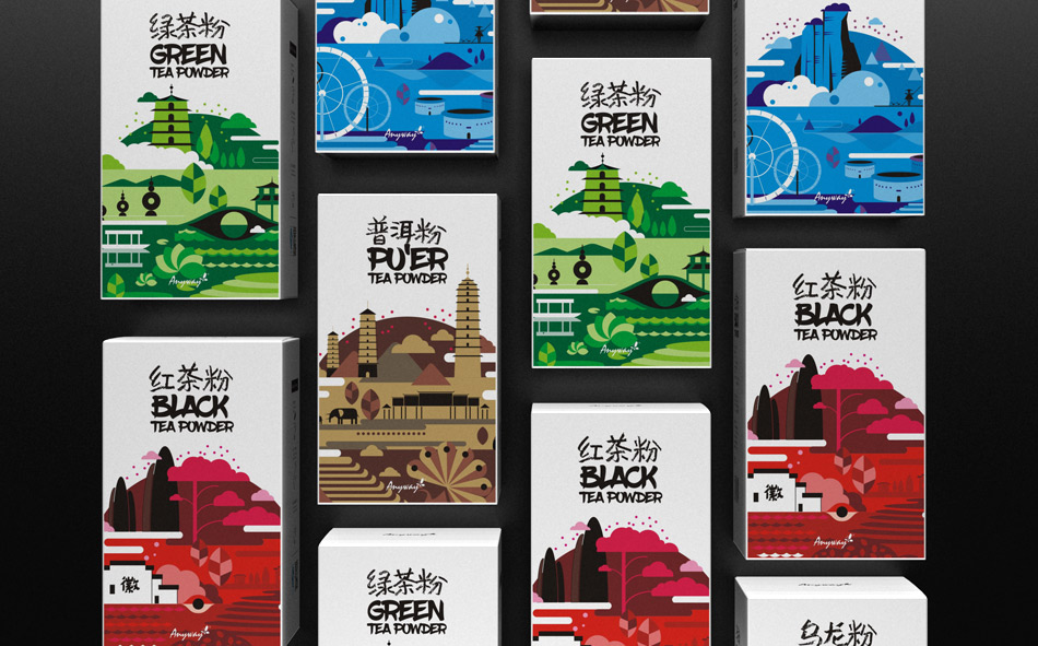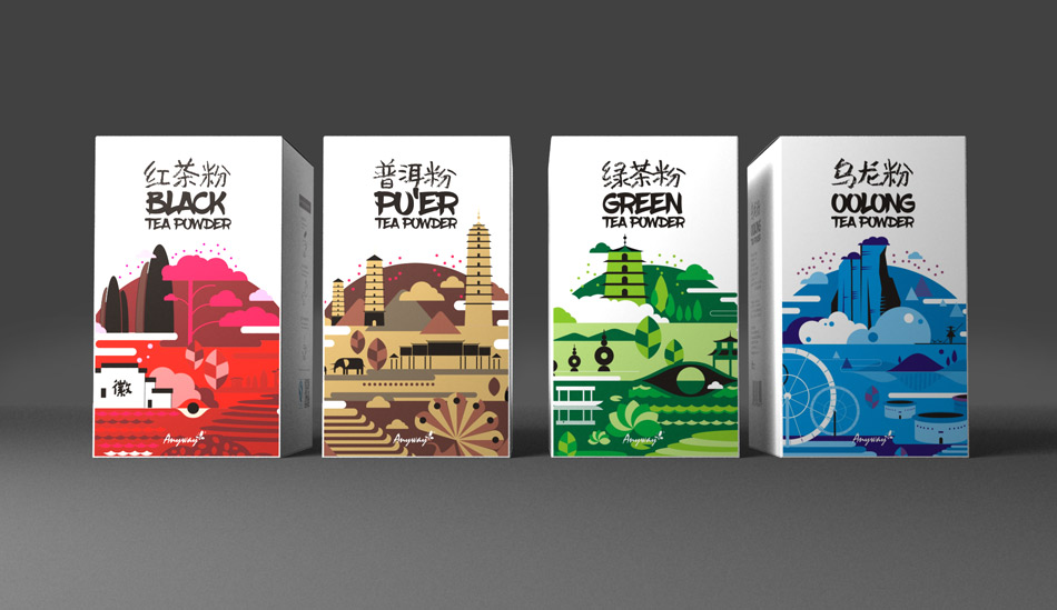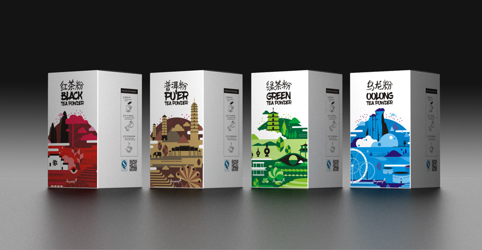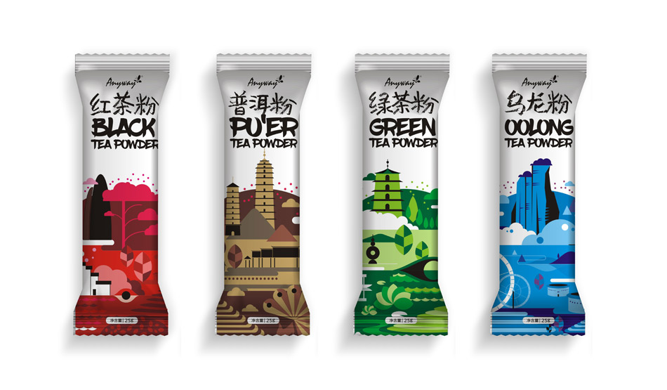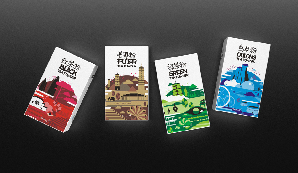 為迎合年輕消費(fèi)群體,隨易推出粉狀茶,以“紅茶”“綠茶”“烏龍”“普洱”四大茗茶為主,在包裝設(shè)計(jì)上突出產(chǎn)地特色,取材產(chǎn)地名勝建筑進(jìn)行藝術(shù)化處理,色彩突出裝飾性,鮮明動(dòng)人。