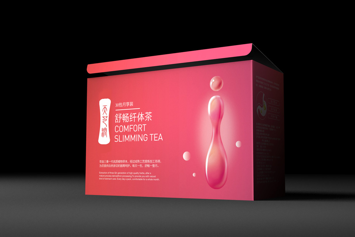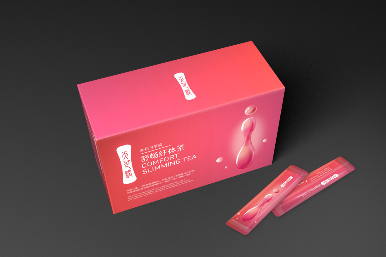 天芝潤纖體茶為純天然生物精粹,能夠提高女性腸道健康排毒,從而提升氣色精神,因此知物在設計中采用了桃紅色,同時采用女性曲線與水滴相融合的設計元素,清晰的詮釋了產品的核心價值。