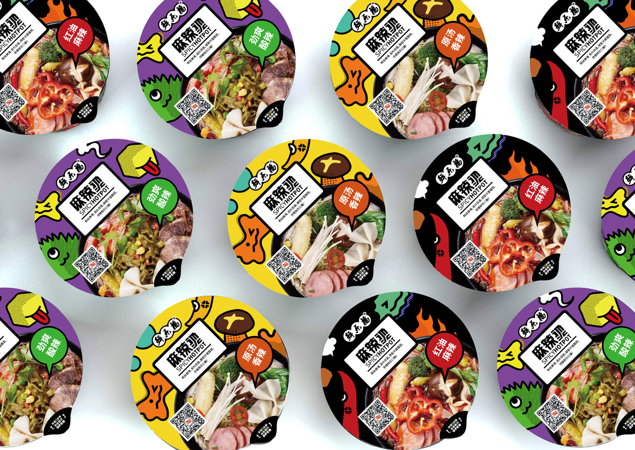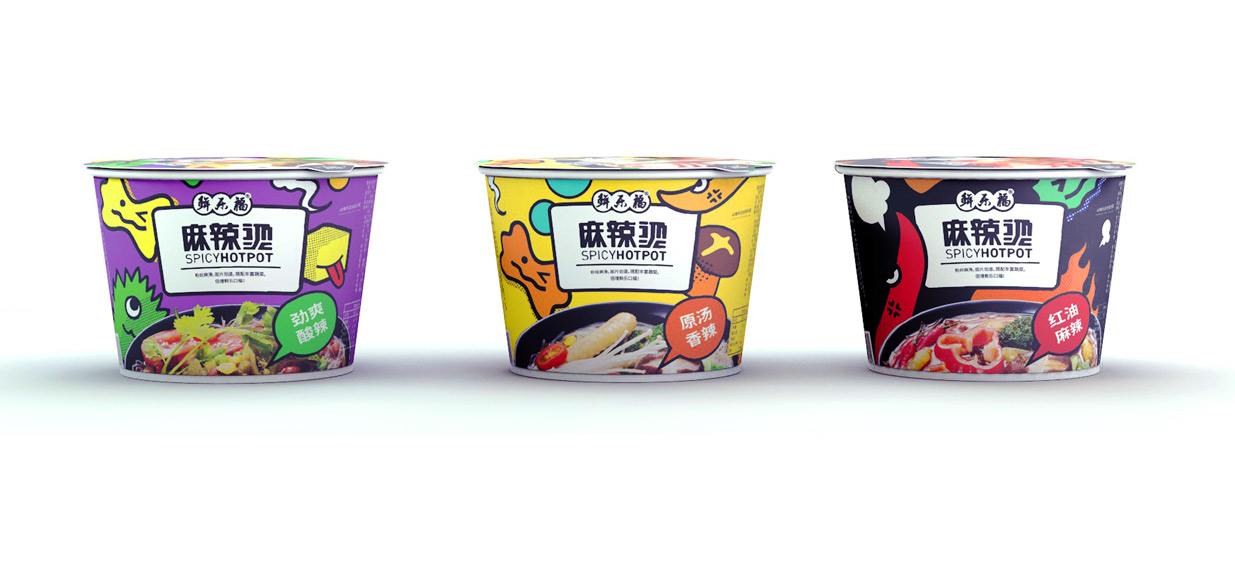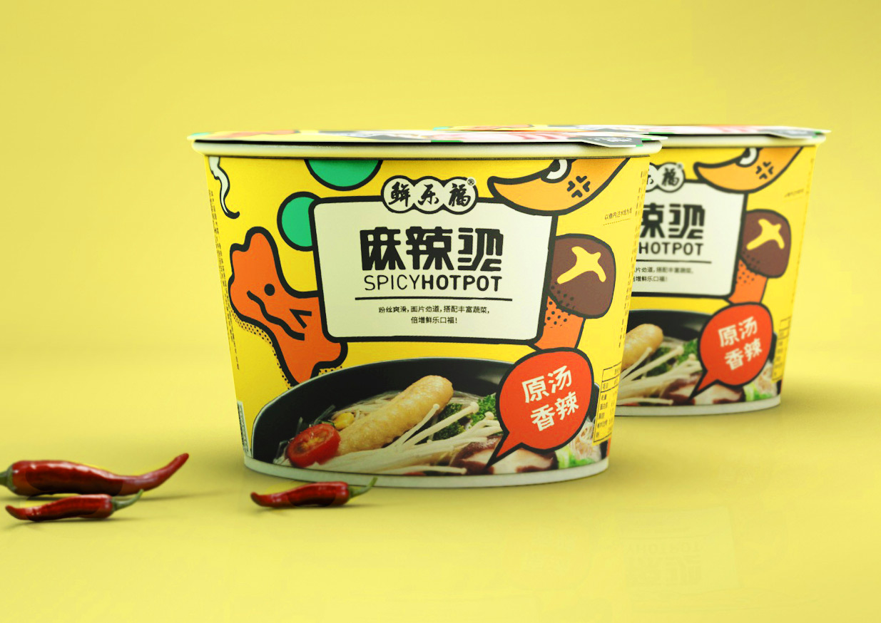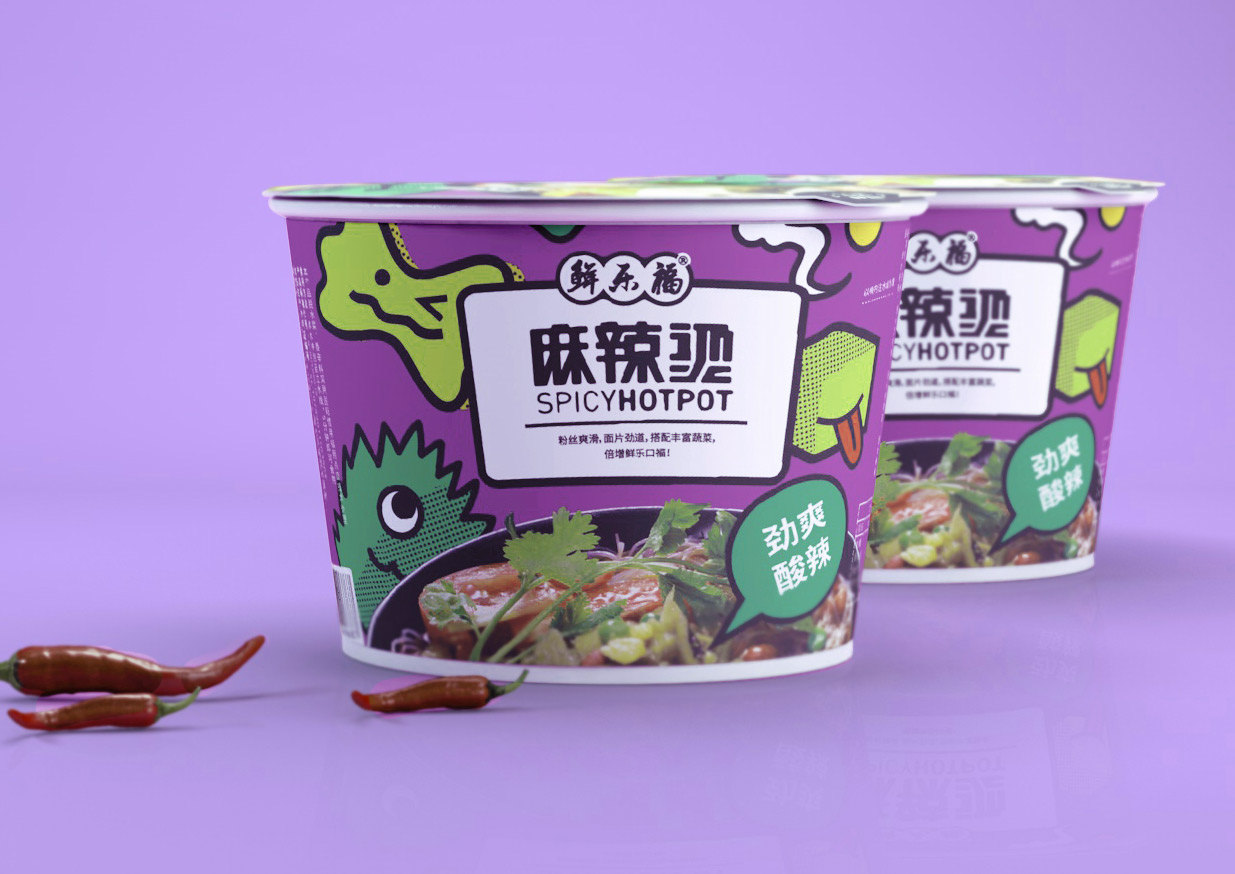 麻辣燙作為大家熟悉的小吃,鮮樂(lè)福將其開(kāi)發(fā)為速食產(chǎn)品,知物在設(shè)計(jì)時(shí)希望呈現(xiàn)出與傳統(tǒng)方便面不同的視覺(jué)風(fēng)格,將食材趣味化設(shè)計(jì),年輕活潑的調(diào)性更加契合年輕人的審美需求。