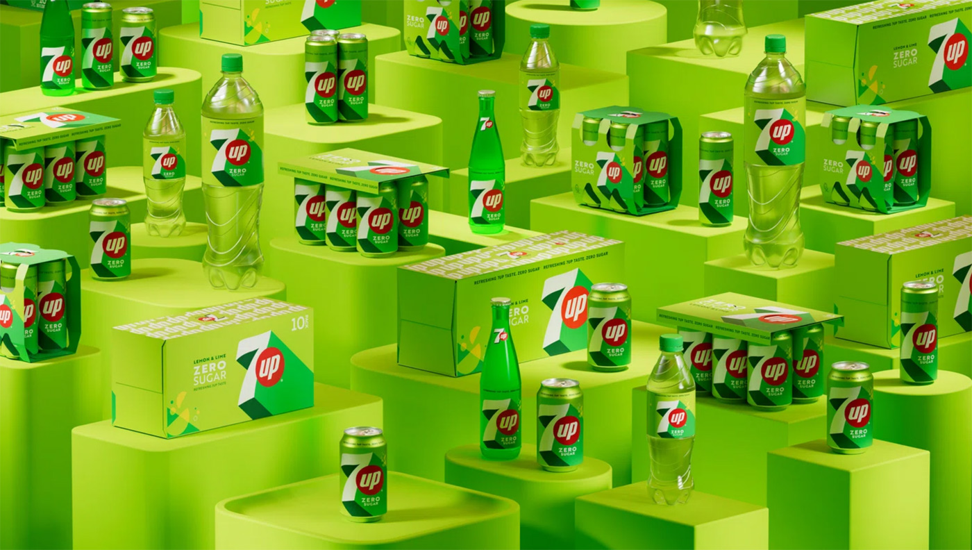 設(shè)計的方向是立體運動感, 7Up保持綠色主色調(diào),添加“熱情的柑橘色調(diào)”。同時,高對比度線條的三維外觀,營造出向上移動的感覺。這種傾斜的呈現(xiàn)方式與字體相呼應(yīng),符合該品牌的“UPliftment”定位。在字體中,增加了幾何元素,更好的體現(xiàn)能量和活力感。