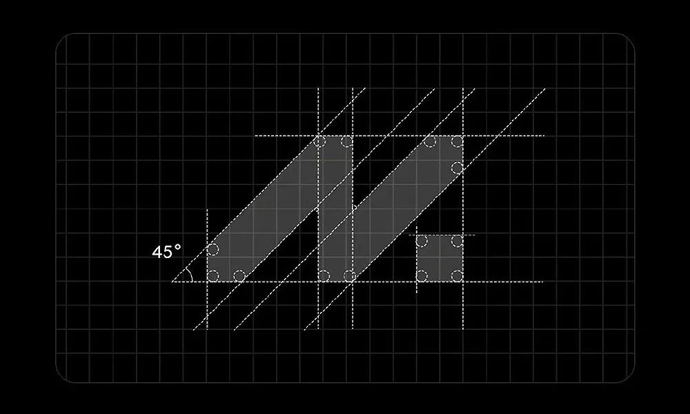45°角設(shè)計(jì)的向上動(dòng)勢(shì),體現(xiàn)熱愛無界的探索精神,圓角處理彰顯有溫度的科技。