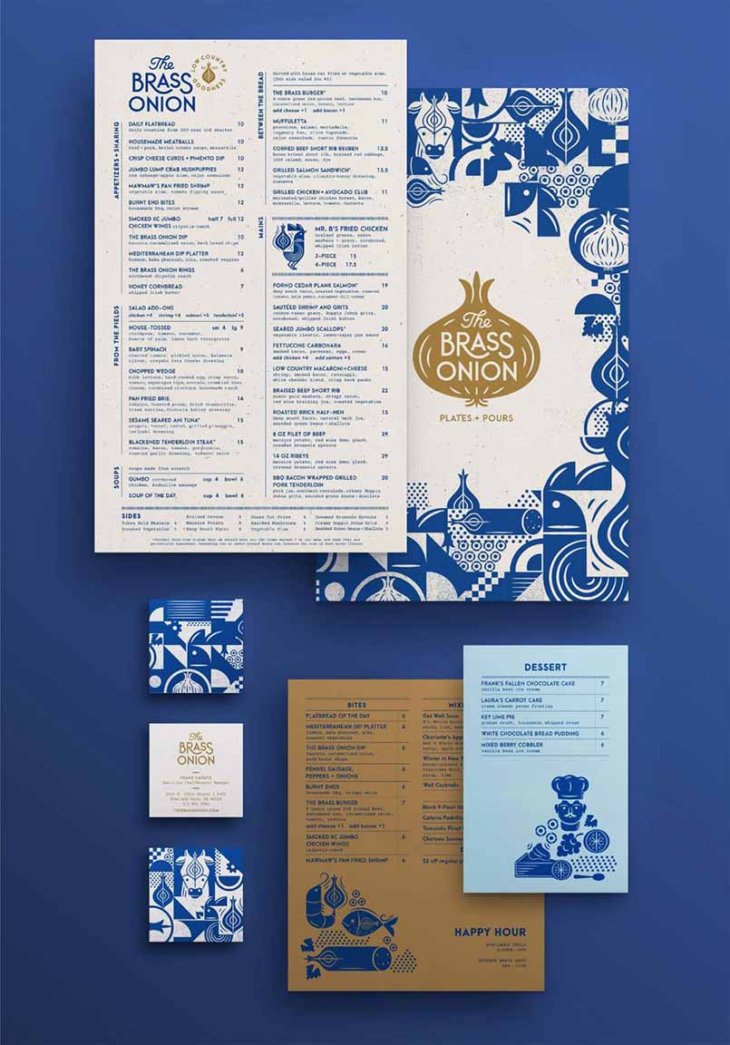 洋蔥作為品牌標識的核心元素,其形象在設計中反復出現(xiàn),為整個視覺系統(tǒng)注入了一抹俏皮的創(chuàng)意。這一圖案不僅融入了各類圖標和視覺元素,還啟發(fā)了圖案設計,靈感源自餐廳內(nèi)引人入勝的馬賽克地磚。從菜單、名片到包裝,這些圖案無處不在,共同營造出一種與用餐體驗相得益彰的統(tǒng)一視覺感受。