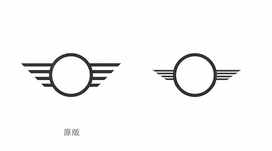 以MINI的LOGO為例子,去掉圓中的MINI字體,左側(cè)為原版的圖形,右側(cè)我將四條線特意擺放的很擁擠,拘謹,這時很明顯左側(cè)原版的標志更加大氣。被我修改過的標志就像狹窄的小巷,不透氣,不夠開闊。